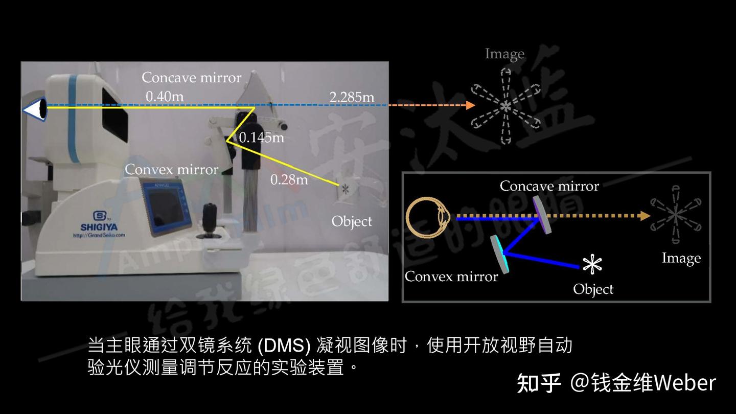 实验对象为57名年龄在7~12岁之间的受试者。实验设置了3种视物距离:0.4m、2.285m(划重点,后文还会提到这个重要数据)、DMS(双镜系统,如下图,眼睛看到的是经两面镜子反射后的虚像),测调节反应(区别于调节刺激)。