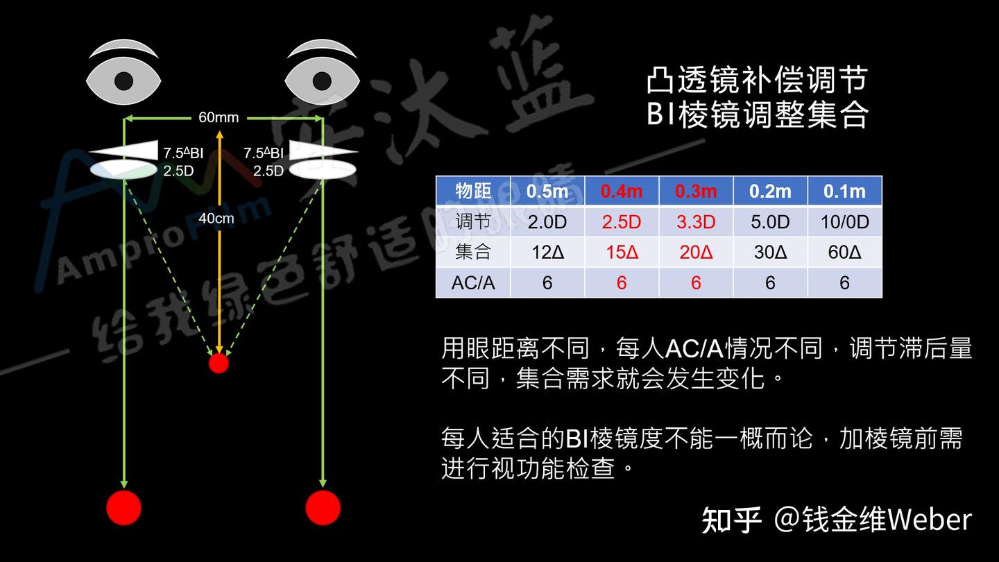 看近时两眼视线需要内聚,即「集合」需求,凸透镜不能够影响,而适当的BI棱镜可以抵消。