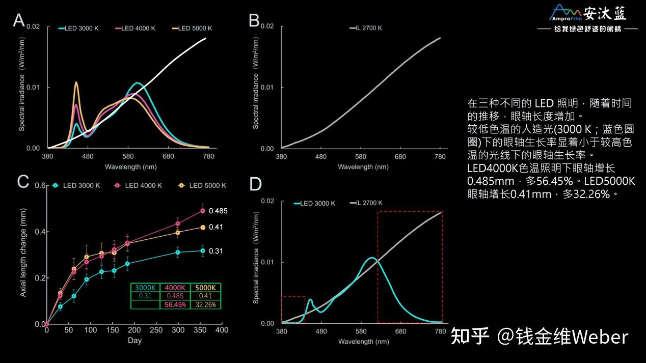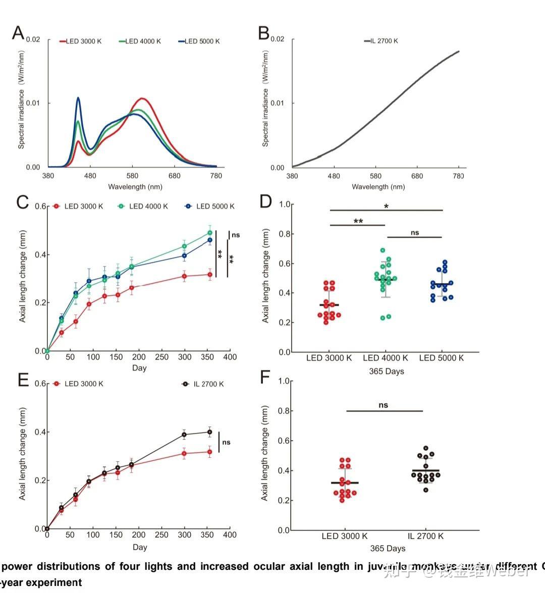 经过观察和分析,在LED灯的照明环境下,低色温照明确实有助于延缓眼轴的增长。然而,令人意外的是,在低色温范围内,2700K的白炽灯照明下,幼猴的眼轴长度却比3000K的LED光下多增长了35.48%。这是为何呢?