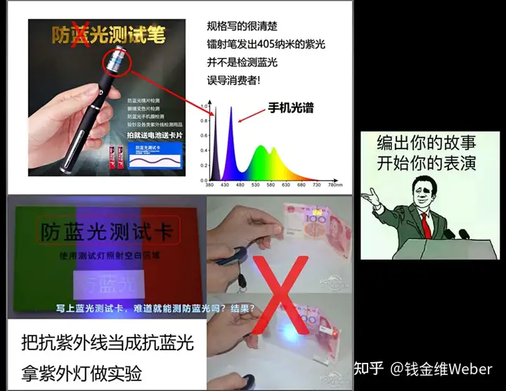许多骗子也因此伪造了许多“防蓝光测试笔”之类的设备,当着消费者的面照一下,可以过滤“蓝光”,进而吹嘘自己的产品功效。这种设备很多测的只是紫光或紫外线,跟LED蓝光可以说是毫不相干。