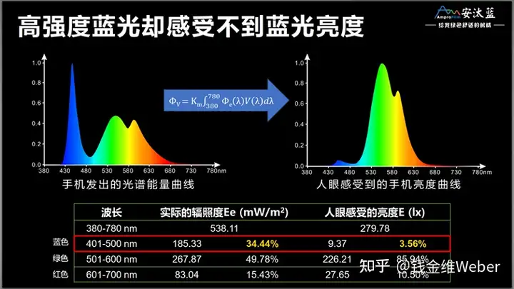 可以看到,实际进入人眼中的光中蓝色的光(λ=401~500nm)占34.44%,而我们视觉上所感知到的蓝色光只占3.56%。这至少说明了两个问题: