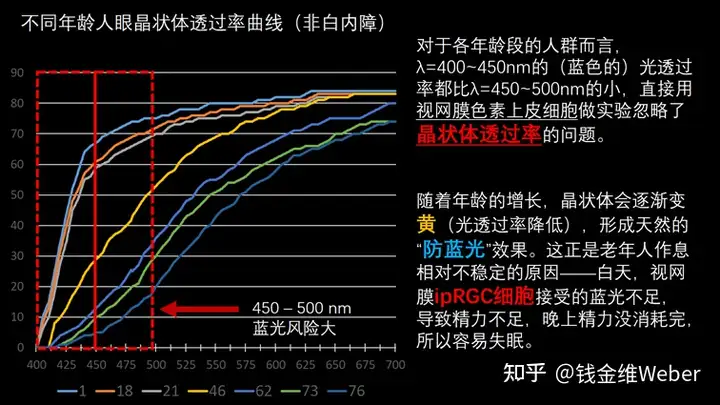 假如与相应的透过率积分,400~450nm波段的蓝光所造成的伤害就会被削弱很多,而且很显然不会超过晶状体透过率更高的相邻波段450~500nm所能造成的伤害值(波段相邻,本身能量只差一点,而平均透过率却相差甚远)。