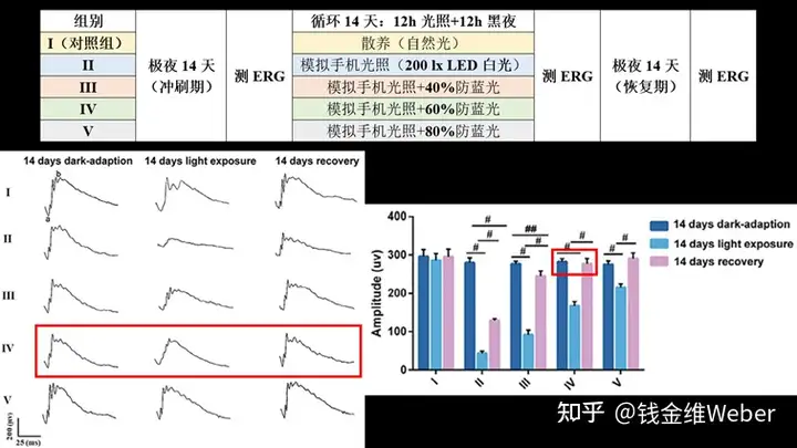 如图,同济大学医学院2019年发布的这项研究中设计了这样的实验[2]:给大鼠佩戴不同过滤比例的防蓝光镜片,检测其视网膜光电转换ERG电图,并统计其振幅。组别处理具体见下表。结果表明,LED白光照射会引起大鼠视网膜光电转换减弱(蓝光过滤比例越高,影响越小),一段时间后,视网膜可以实现部分“自愈”(对应粉色柱形图),但只有佩戴60%的IV组和80%的V组大鼠实现了“完全自愈”至LED白光照射前的状态。那么,根据经济性原则,当60块和80块所买到的效果一样时,我们肯定选择60块的。所以,结合防蓝光眼镜对大鼠的护眼效果和“光谱形状接近”的理论推算值,目前的防蓝光产品最佳过滤比例应当选取在60%左右。