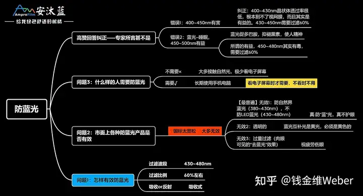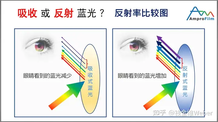 要选取吸收式,这一点很容易理解。反射式的防蓝光产品是利用“反弹”的盾牌把蓝光弹回去,但是防蓝光产品一定是透明的、双面的,这个盾牌确实把眼睛另一面的蓝光弹走了,但是眼睛这一边的蓝光原本不至于对眼睛造成伤害的,带上它之后全给集中起来弹进眼睛里去了。。。这种“双面反弹”式智商税,防一面害一面,具体是防的多还是害的多就看你运气了。