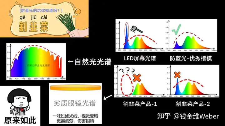 下图介绍了两种割韭菜产品,一个是防得过头了,把不该过滤的也过滤掉了,会造成眼疲劳而伤眼;一个是防得不够,危险仍存(如果看到透明的防蓝光眼镜,要有“一眼假”的信心,必须是黄色的才能有用,透明的就是可见光里啥也没防,只能防辐射)。所以过犹不及,这两者都是不可取的。