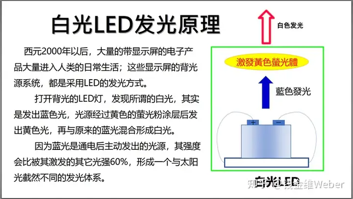 LED的发光原理是用蓝色光源去激发黄色的荧光粉,从而发出白色的光。
