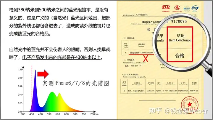 因为国家的防蓝光检验标准实在是太宽松了,检测的阻挡范围在380~500nm,这就直接导致了市场乱象:只要不伤眼的镜片都能通过检测,而对消费者的选择却无法起到任何的指导作用。