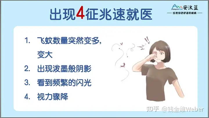 根据多数临床医生的说法,80%的飞蚊症都是“良性”的,放着不治也没事。但剩下20%的危险情况患者自己应当如何判断呢?以下四种现象即为“恶性”飞蚊症的征兆,有可能会引起视网膜并发症导致失明,一旦发生,务必速速就医!