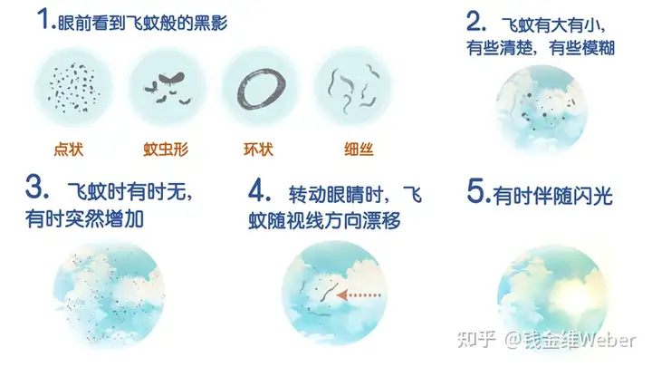 开头我们提到,飞蚊症不管是良性的还是恶性的,它所产生的症状都是非常令人痛苦的。具体有以下五大症状,大家可以自行代入想象一下:
