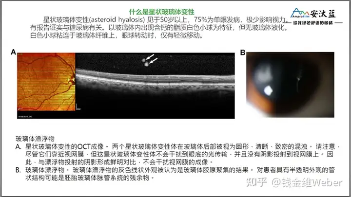 “飞蚊位置固定即为良性”是一个绝对的谬论。首先,“飞蚊”之所以会被看到,就是因为它们是眼睛光学系统中动来动去的障碍物。我们的左右眼可以互相提供视觉补偿,对于不动的障碍物,经过视觉补偿之后,在患者的视觉中是不会被感受到的(也许会影响清晰度,但绝不会出现部分视线缺失的情况)。动来动去的玻璃体内漂浮物因位置不固定而无法得到稳定的视觉补偿,所以才会明显影响到患者的视觉感受。所谓位置固定的“飞蚊”,其实是另外一种玻璃体变性的情况——星状玻璃体变性(asteroid hyalosis)。这种变性并没有伴随玻璃体的严重液化,玻璃体大体上仍然是呈固体凝胶状的,其内的障碍物是卡在胶原蛋白原纤维之中的,可以通过医学设备观察到,但并不会使患者产生视觉缺失。这种玻璃体内障碍物是钙化的物质,与飞蚊症漂浮物的产生原理以及形态均不同,有报告证实其与糖尿病有关[1]。