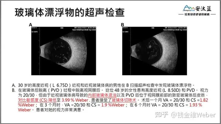 “恶性”飞蚊症对应的就是异常的玻璃体变性。而“良性”飞蚊症的情况则是当正常的玻璃体变性发生到较为显著的程度时,由视网膜前出现的漂浮物所导致产生的。由于每个人从生命早期开始眼睛里就一直在发生着玻璃体变性,所以“良性”飞蚊症可以理解为人眼老化必然的结果,而高度近视者由于眼轴较长,往往会比其他人更早出现“良性”飞蚊症。在医学上一般采用B扫描超声检查来确定玻璃体的浑浊程度,反射回来的超声波声量越大,则代表玻璃体内的漂浮物越多,飞蚊症越严重。