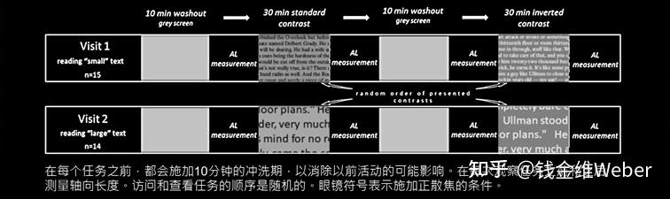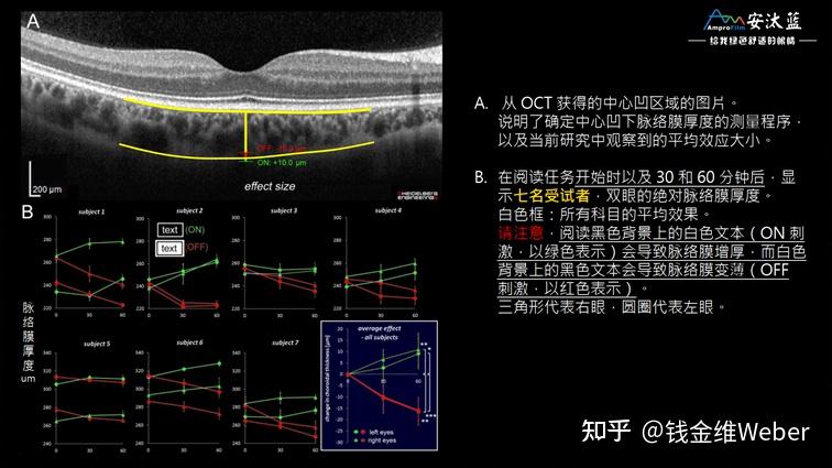 其实去年我就在《长时间阅读、写作、写程序时,白底黑字和黑底白字哪个对眼睛更好?》这篇回答中和大家分享过这个研究在2018年所得到的初步结论,即白底黑字加重近视而黑底白字抑制近视。眼睛视觉系统中存在着这样两种视觉信号——ON和OFF,其中ON信号由暗背景中的光亮(典例:黑底白字)刺激产生,通过其对应的ON通路中传输至大脑;而OFF信号则由亮背景中的暗处(典例:白底黑字)刺激产生,通过OFF通路传输至大脑。所以,我们平时不管是在阅读“纸质版”还是“电子版”的白底黑字文本时,往往会过度激发OFF通路。图宾根大学的研究小组在初步研究中设计了这样的实验:使7名受试者分别阅读白底黑字或黑底白字30分钟和60分钟,在这个过程中用OCT检测脉络膜的厚度变化;最终得到的结果为:当受试者在白色背景下阅读黑色文本时,脉络膜在一小时内变薄了约16μm;当他们从黑色背景中阅读白色文本时,脉络膜增厚了约10μm。所以他们认为,过度刺激OFF通路与脉络膜变薄存在着直接关联,反之则会引起脉络膜变厚[1]。