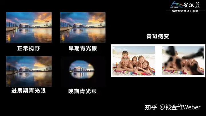 视觉变化:青光眼(从周围缩小)VS黄斑病变(中央出现黑斑)