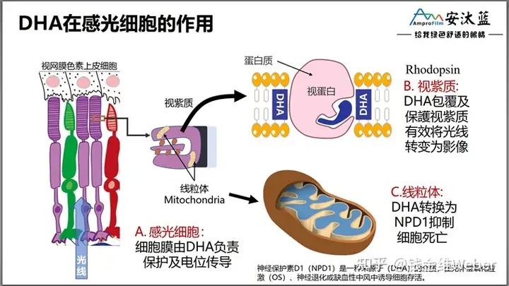 作为视网膜细胞和脑细胞的细胞膜及其内的线粒体膜的主要磷脂成分,DHA起着维持膜电位、减轻线粒体氧化应激和保护视紫质的作用: