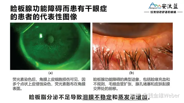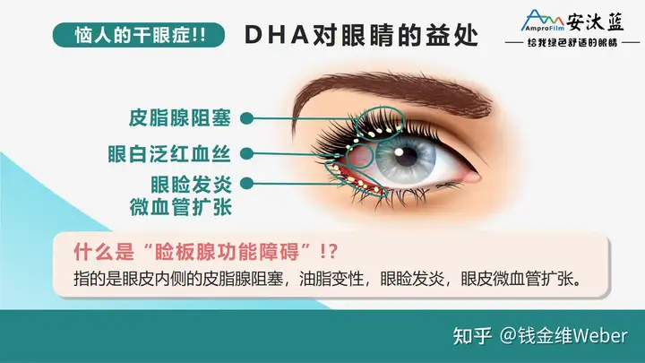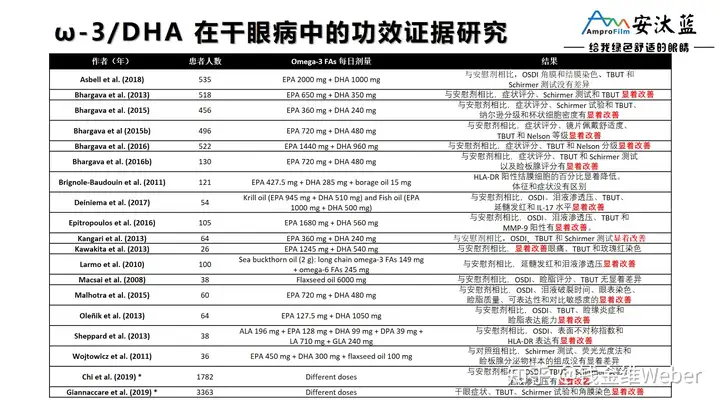 如图,干眼症的典型症状为角膜上皮损伤和睑板腺功能障碍,病因在于睑板脂分泌不足所导致的泪膜不稳定和蒸发率增加。而ω-3(或者说DHA)对于干眼症而言,可以说是最为对症下药的营养素,有着充足的实验证据(剂量及配比见下图)。