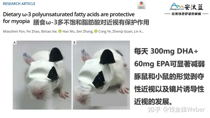 每天灌胃300mgDHA+60mgEPA可显著减弱豚鼠和小鼠的形觉剥夺性近视以及豚鼠的镜片诱导性近视的进展;