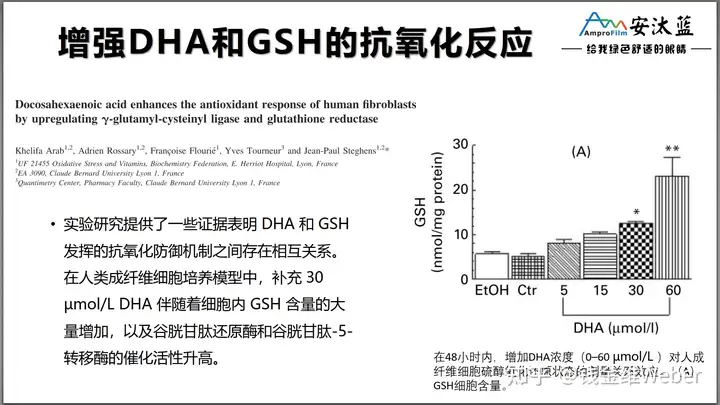 谷胱甘肽 (GSH) 是细胞中合成的最丰富的低分子量硫醇化合物,在保护细胞免受氧化损伤和维持氧化还原稳态方面起着关键作用。《British Journal of Nutrition》2006年刊登的一则研究显示,对培养的人类成纤维细胞补充DHA可以使其内的GSH水平大幅增加[4],即,(30μmol/L的)DHA可大幅提高细胞的抗氧化能力。