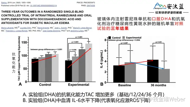 2019年,《Retina》刊登的一项研究设计了这样的实验:受试者为随机选择的糖尿病性黄斑水肿患者,对照组仅注射雷尼珠单抗(抗新生血管生成药物,即抗VEGF),实验组在此基础上,口服DHA和抗氧化剂。结果表明: