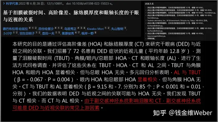 眼轴增长——日本庆应义塾大学医学院2022年6月28日最新发表的论文发现,TBUT(泪膜破裂时间)与AL(眼轴长度)和CT(脉络膜厚度)显著相关,眼轴的增长会导致泪膜破裂时间缩短,从而引发干眼症[10]。