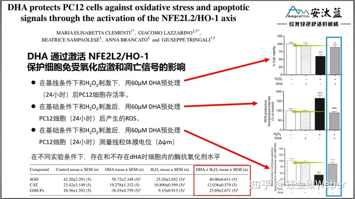 根据《International journal of molecular medicine》2019年刊登的一则研究,过氧化氢H2O2(属于一种活性氧)刺激会使得PC12细胞存活率降低、自由基ROS浓度上升以及线粒体膜电位降低,在此基础上,用60µmol/L DHA预处理24小时,几乎可以使PC12细胞完全抵御实验中H2O2刺激所带来的影响(细胞存活率、ROS产量、线粒体膜电位可基本维持在正常水平,酶抗氧化剂水平远优于单独H2O2处理时的情况)[5],即,足量的DHA可使细胞“免疫”于活性氧的攻击。
