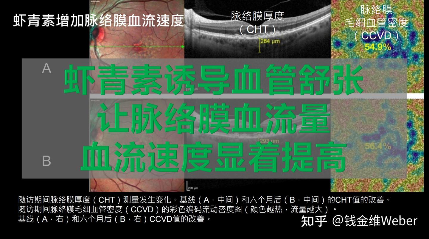 日本富山医科药科大学针对虾青素增厚视网膜脉络膜血管方面进行了临床研究,志愿者被随机分为两组:虾青素组每天口服虾青素,持续4周;安慰剂组接受外观相同的口服安慰剂。补充4周后,虾青素组双眼的视网膜毛细血管血流量显着高于补充前,而安慰剂组的视网膜毛细血管血流量没有变化。在补充期间,两组的眼压均保持不变。研究的结果表明,补充虾青素会增加视网膜毛细血管血流量。