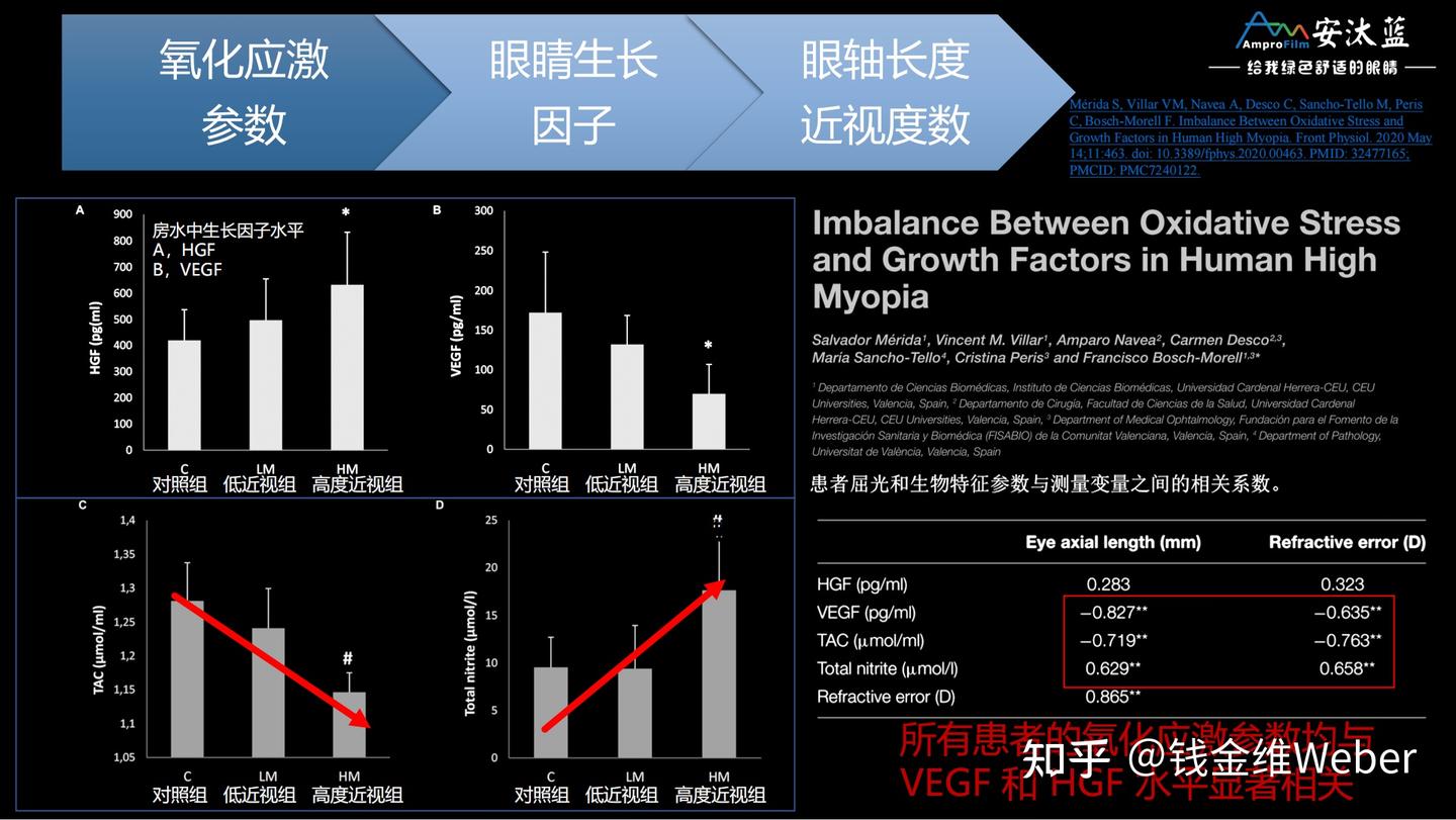 西班牙的研究表明了氧化应激可能是所有近视发生的最初来源。在对低度近视和高度近视患者分析中,发现氧化应激的浓度与近视相关生长因子显著相关。氧化应激会把隐性生长因子激活成显性,刺激近视生长因子发生新的改变,表现出某一些生长因子水平升高,某一些生长因子水平降低[6]。VEGF作为近视生长因子之一,与眼轴长度的相关性高达-0.827。眼轴越长,血管内皮生长因子(VEGF)的浓度越低。在氧化应激的刺激下,VEGF的浓度降低,进而促进眼轴增长,诱导近视发生。