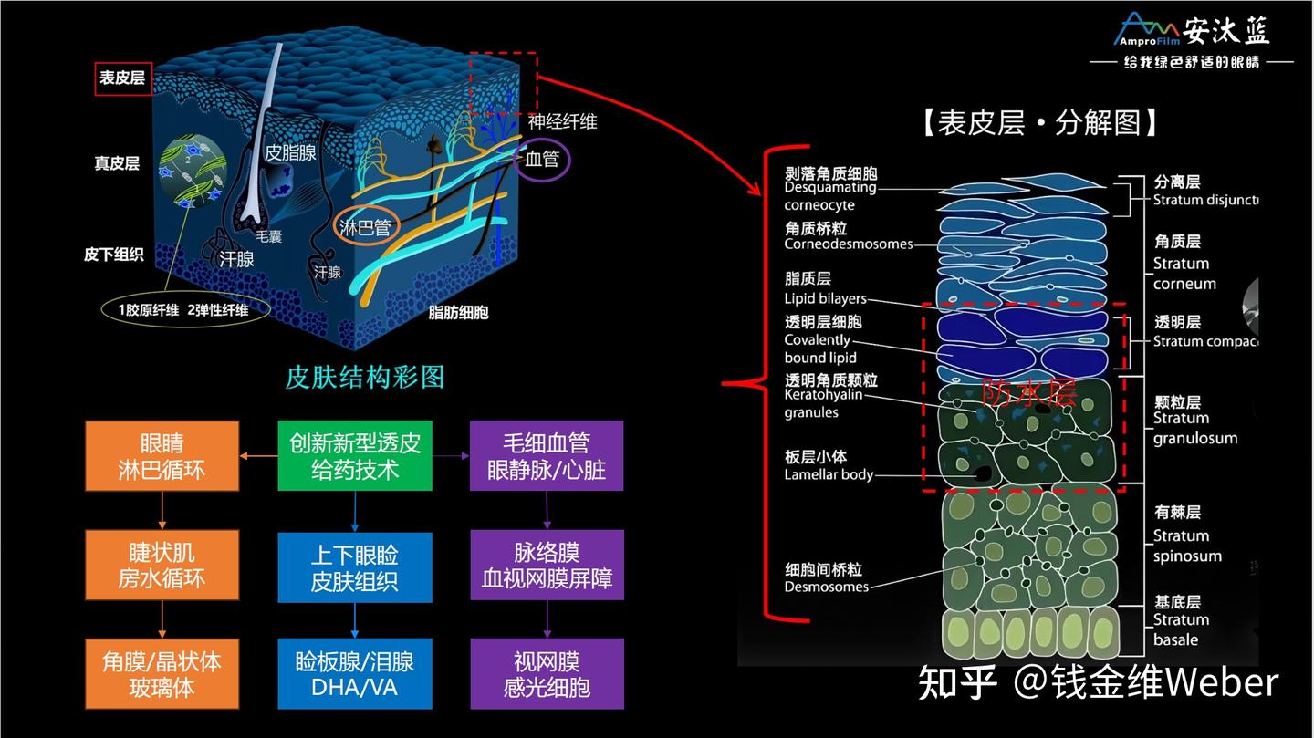 我们可以看到皮肤是分层的,有表皮层、真皮层、皮下脂肪。而表皮层进一步细分为角质层、透明层、颗粒层、有棘层和基底层。其中,角质层、透明层和颗粒层共同构成了防水层,对水分和大多数营养物质具有良好的阻隔作用,这也是普通水性眼贴产品只能作用在皮肤表层,而无法把营养输送到眼组织中去的原因。