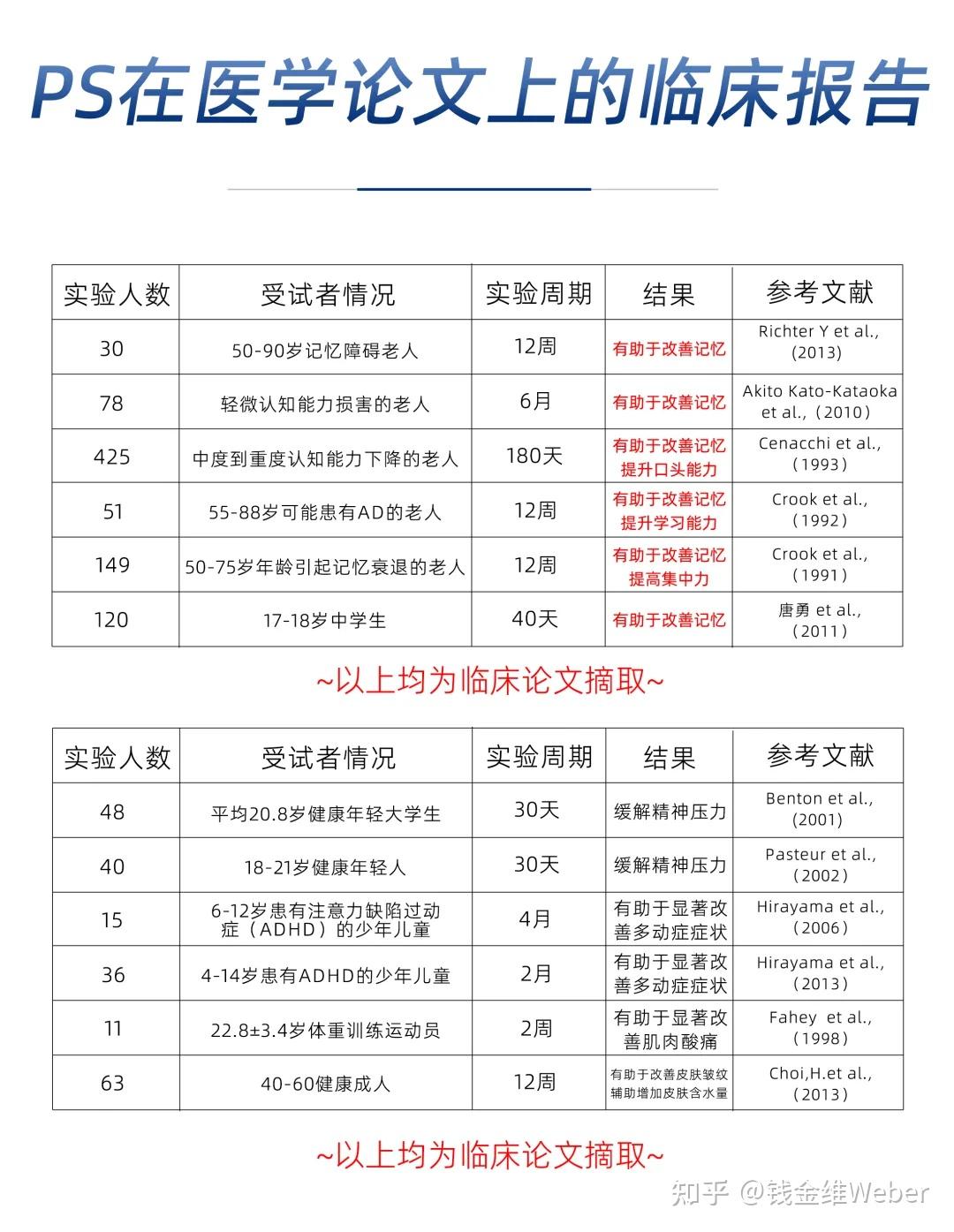 在MEDLINE上对2014年6月之前发表的关于PS和人脑的相关文章进行了科学文献检索,并审查了127篇相关文献。研究[19]表明,健康的神经细胞膜磷脂需要PS的参与。DHA介导的PS能够增强神经细胞的生化改变,包括短期记忆的形成、长期记忆的巩固、创造新记忆的能力、提取记忆的能力、学习和回忆信息的能力、专注力、推理和解决问题的能力、语言能力和沟通能力。