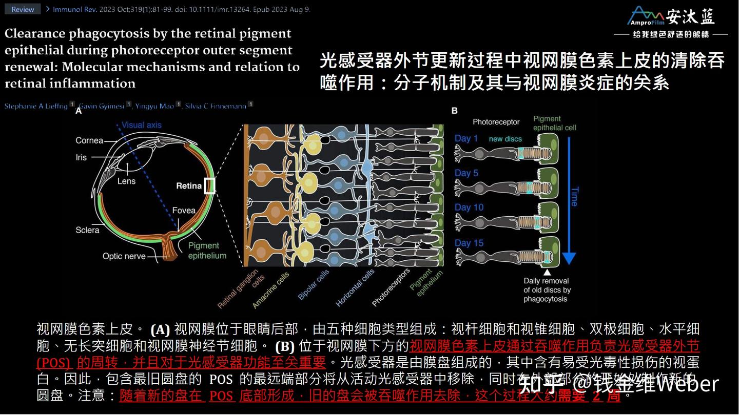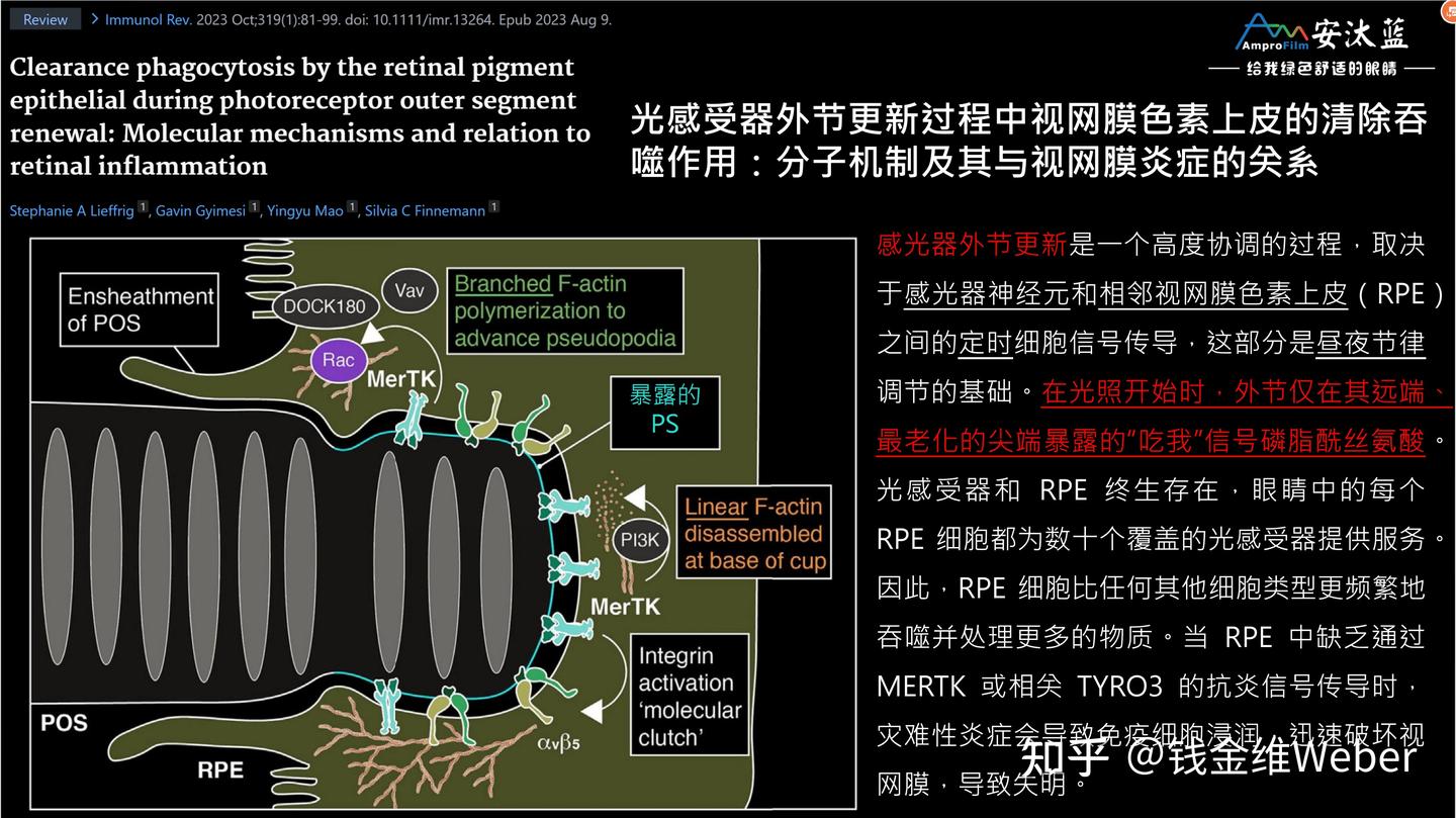 [20]Lieffrig SA, Gyimesi G, Mao Y, Finnemann SC. Clearance phagocytosis by the retinal pigment epithelial during photoreceptor outer segment renewal: Molecular mechanisms and relation to retinal inflammation. Immunol Rev. 2023 Oct;319(1):81-99. doi: 10.1111/imr.13264. Epub 2023 Aug 9. PMID: 37555340; PMCID: PMC10615845.