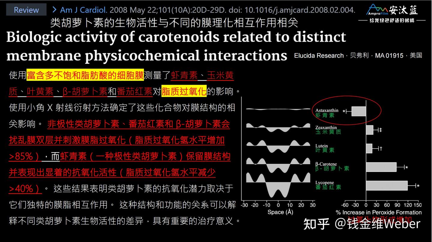 在美国 Elucida Research 的研究[12]中,使用富含多不饱和脂肪酸的细胞膜,测量了虾青素、玉米黄质、叶黄素、β-胡萝卜素和番茄红素对脂质过氧化的影响。唯有虾青素保留细胞膜结构并表现出显著的抗氧化性(脂质过氧化水平减少>40%)。这种结构和功能的生物活性的差异,可以解释虾青素对视网膜具有重要的治疗意义。