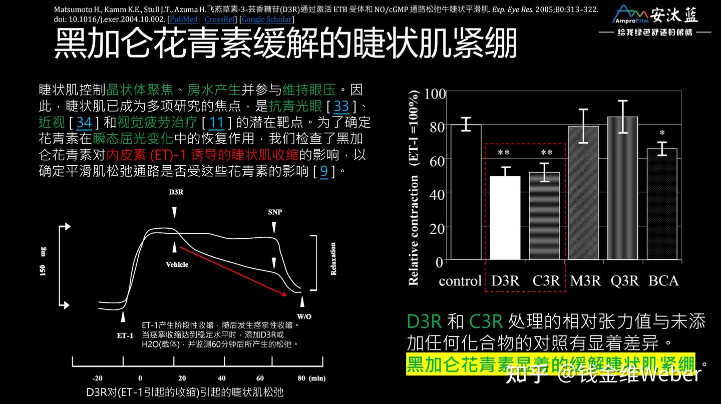 黑加仑花青素中的两种主要成分——飞燕草素芸香苷(D3R) 和 矢车菊素芸香苷(C3R),在促进睫状肌松弛方面表现出显著的效果。特别是飞燕草素芸香苷(D3R),在添加后仅20分钟内就能显著促进睫状肌的松弛。相比之下,对照组蒸馏水在前60分钟内并未观察到明显的松弛趋势,直到60分钟后才开始出现睫状肌的松弛;杨梅素-3-芸香糖苷(M3R)的促松弛效果与对照组蒸馏水相似;而槲皮素-3-芸香糖苷(Q3R)的促松弛效果甚至不如蒸馏水[15]。这表明,促进睫状肌松弛的主要花青素成分集中在飞燕草素和矢车菊素上,集中含有这两种花青素的黑加仑花青素可以显著缓解睫状肌紧绷,对预防假性近视、减轻眼疲劳以及降低青光眼的风险具有积极作用。