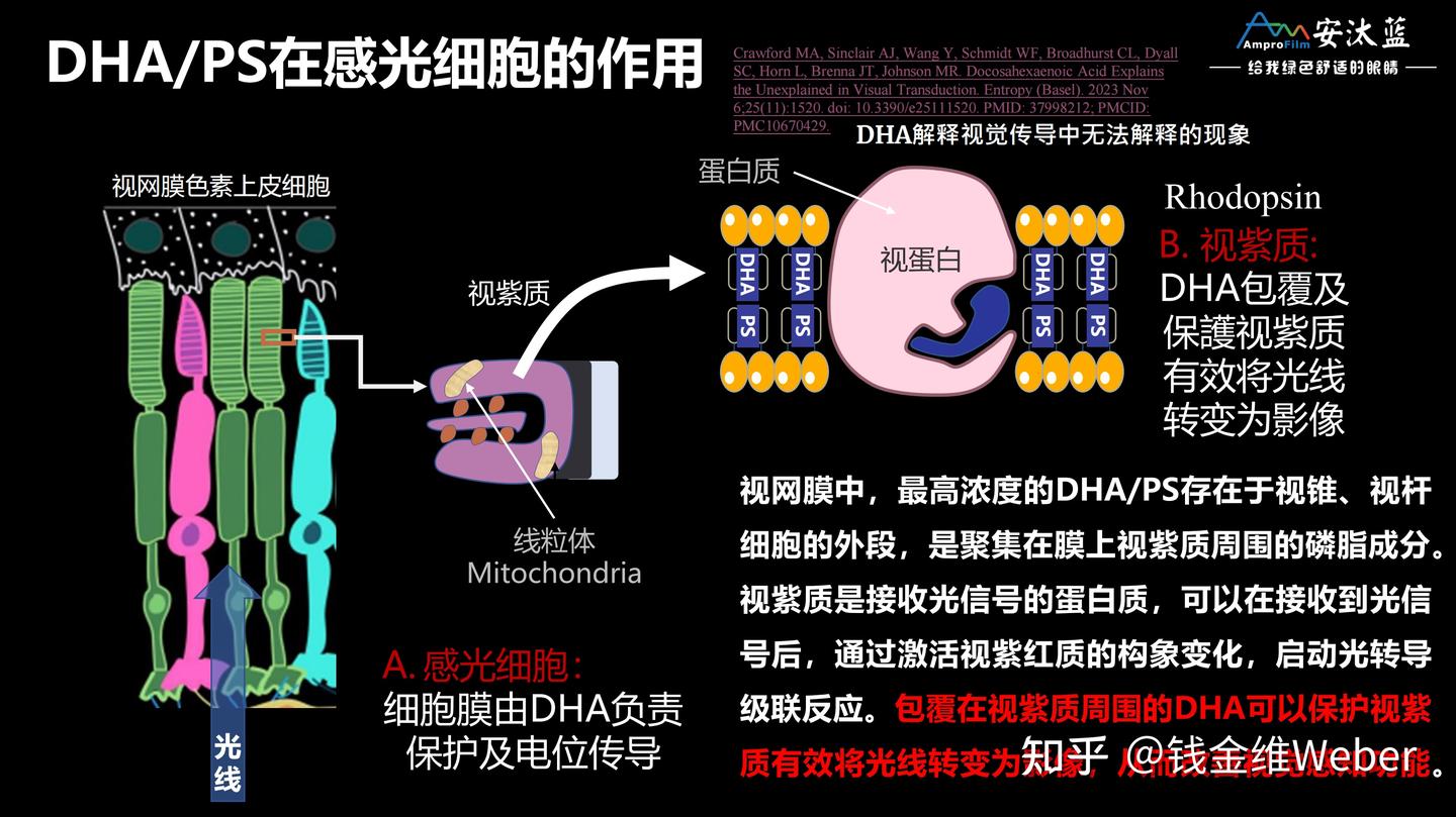 光进入眼睛后,被视网膜上的视锥细胞和视杆细胞接收。这些细胞的外节富含DHA和PS,DHA和PS主要聚集在膜上的视紫质上,更具体地说,是包围在视紫质的视蛋白周围。当视紫质接收到光信号时,会进行光电转换,将光信号转化为神经信号。而DHA和PS包围在视紫质周围,起到保护作用,确保其能够成功的进行光电转换,并且信号不失真。因此,DHA和PS对眼睛的光电转换过程至关重要,有助于提升裸眼视力和戴镜视力。