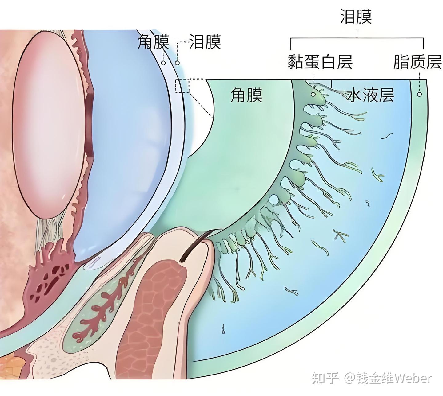 泪膜由三层结构组成:从内到外分别是黏蛋白层、水液层和脂质层。这三层结构共同维护着眼睛的湿润和舒适。脂质层位于最外层,主要作用是减少泪液的蒸发;水液层则提供保湿和润滑,在中间层;而黏蛋白层则帮助泪膜紧密地贴附在角膜表面,在最里层。然而,泪膜中的水层非常薄,仅有几微米(10^-6米),一旦最外层“脂质层”出现问题,水层就会迅速蒸发,导致干眼症状的出现。