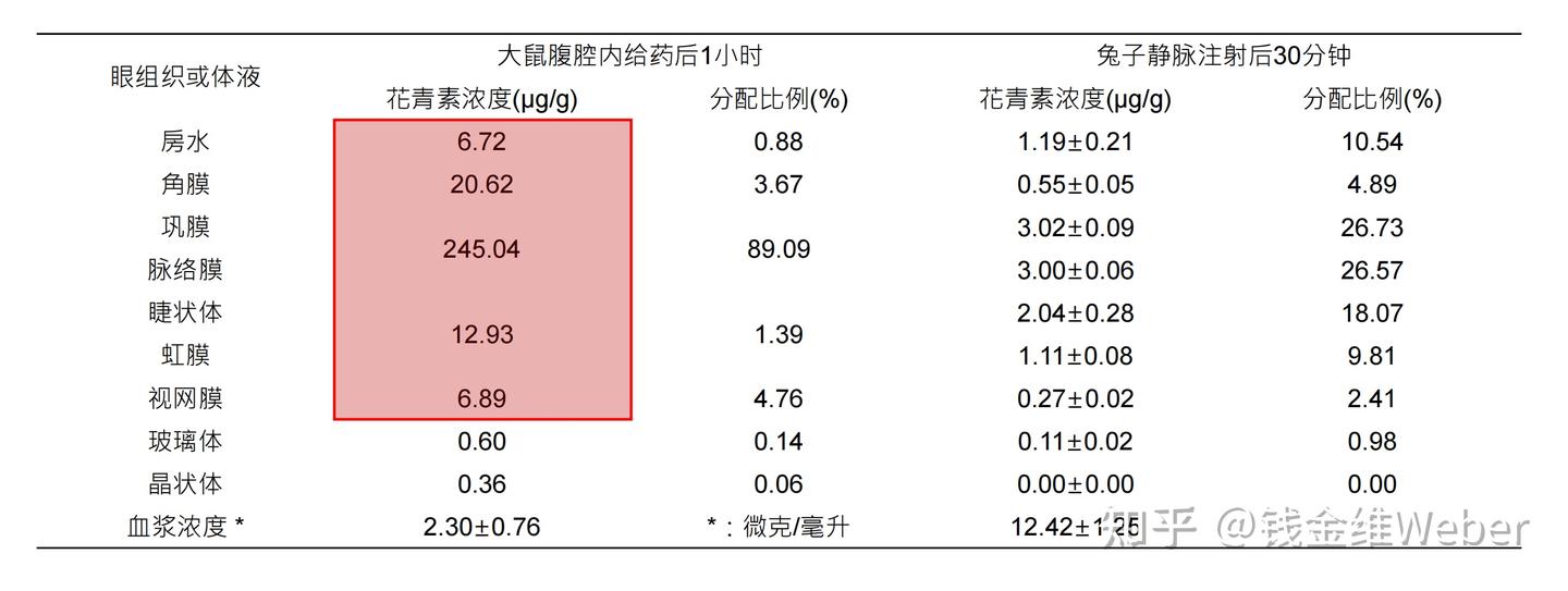 大鼠腹腔给药后1小时和兔静脉给药后30分钟黑加仑花青素的眼组织分布